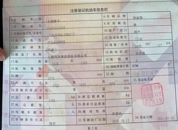 初次登记日期 2020-10-13 车辆名称 荣威i6 MAX