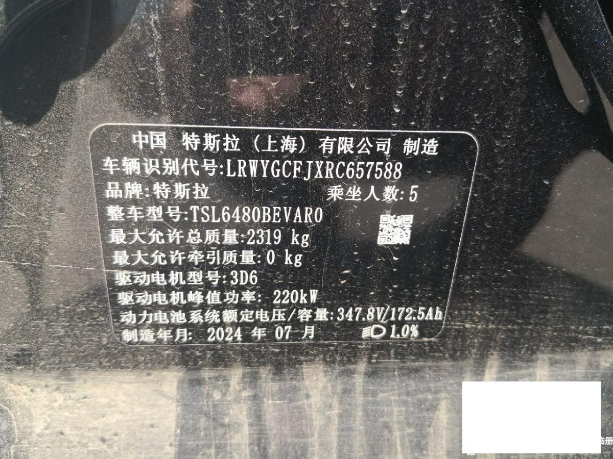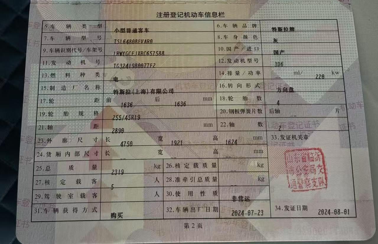 初次登记日期 2024-08-01 车辆名称 特斯拉 Model