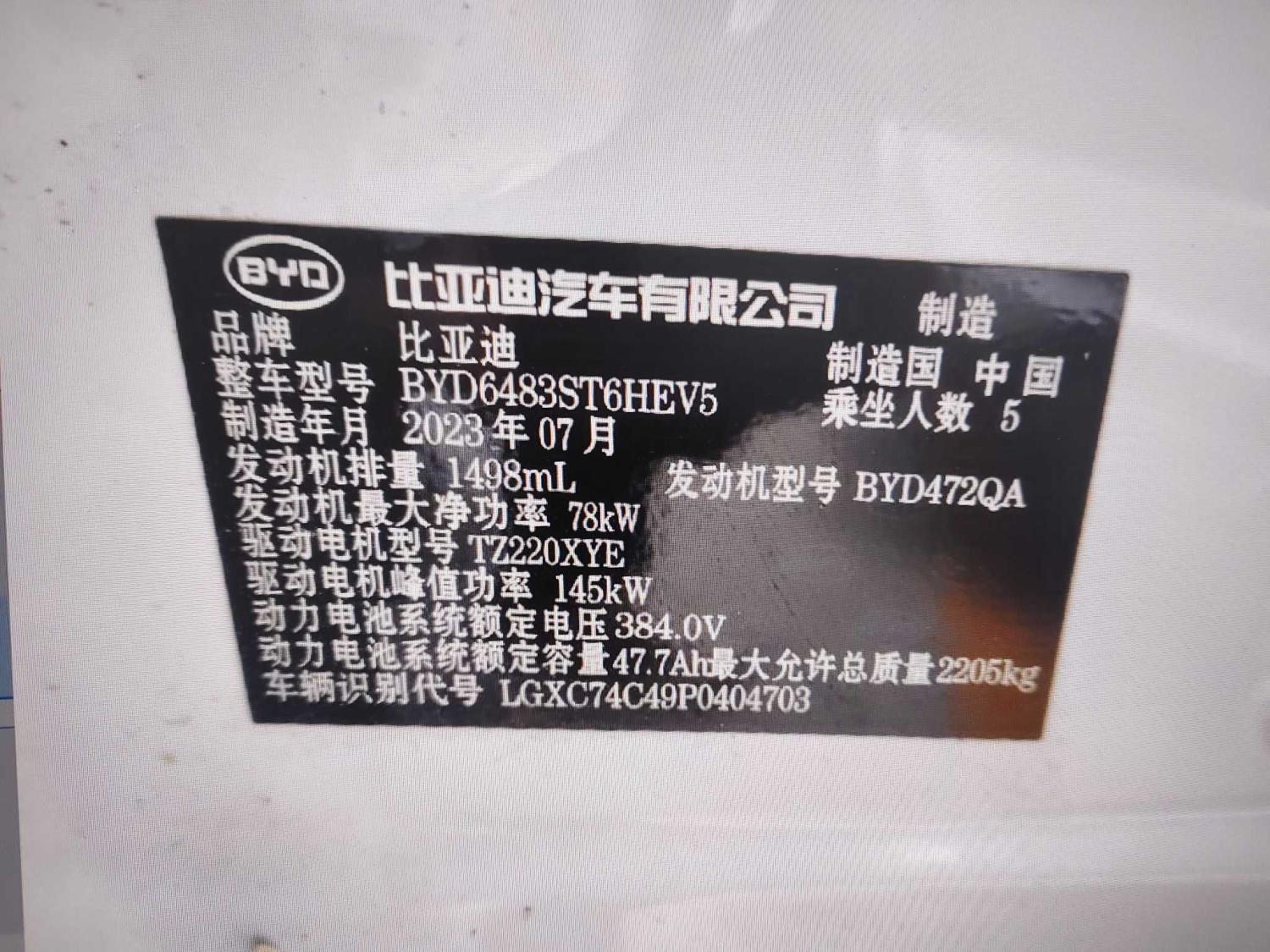 初次登记日期 2023-08-10 车辆名称 比亚迪 宋