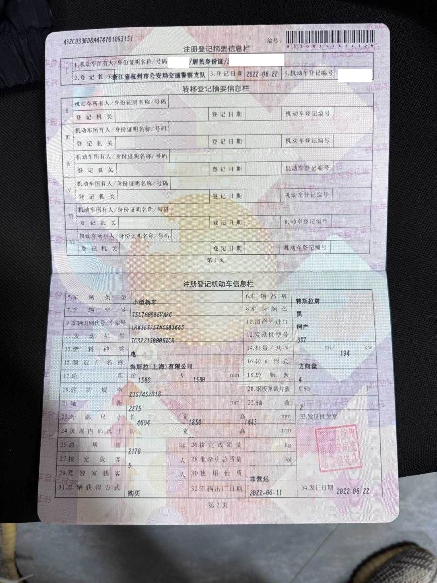 初次登记日期 2022-06-22 车辆名称 特斯拉 Model