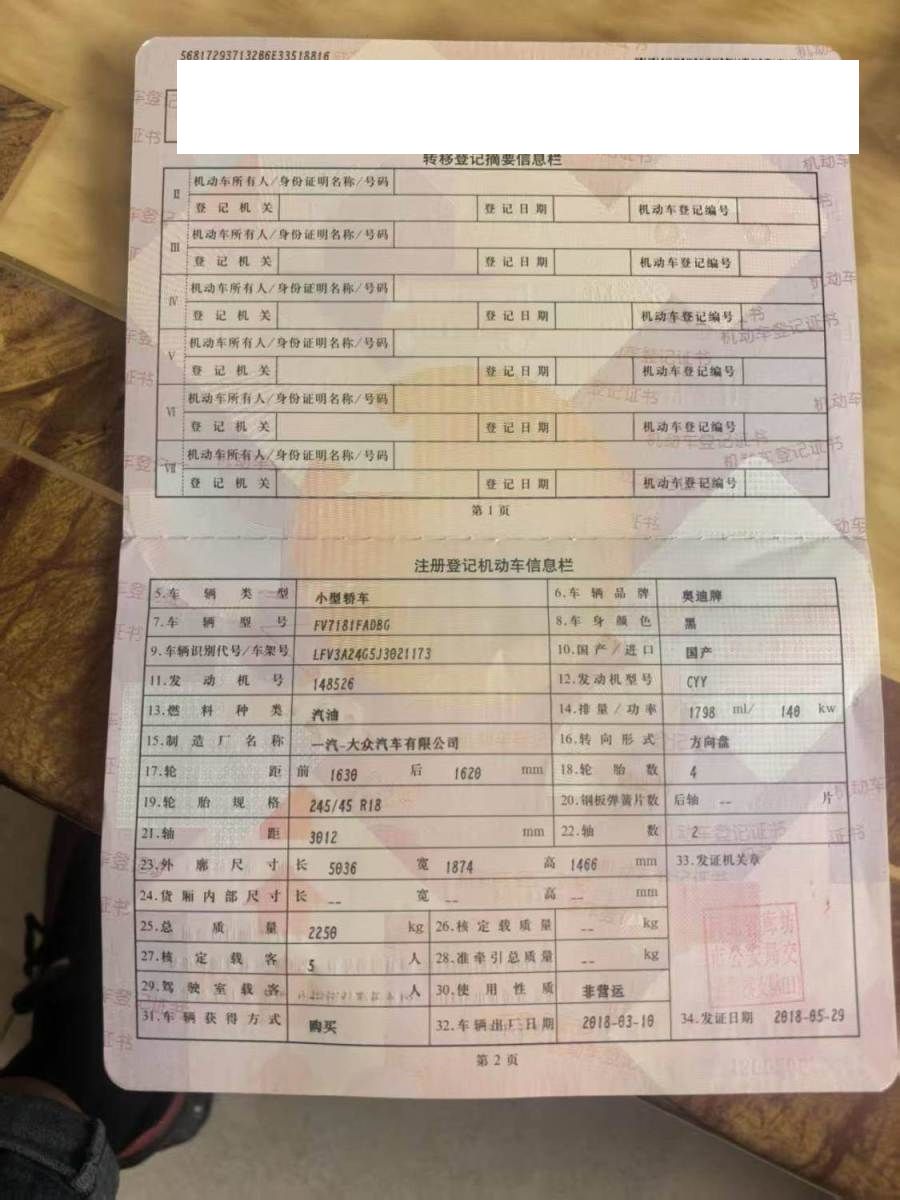 初次登记日期 2018-05-29 车辆名称 奥迪A6L