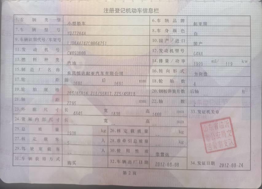 初次登记日期 2012-08-23 车辆名称 起亚K5