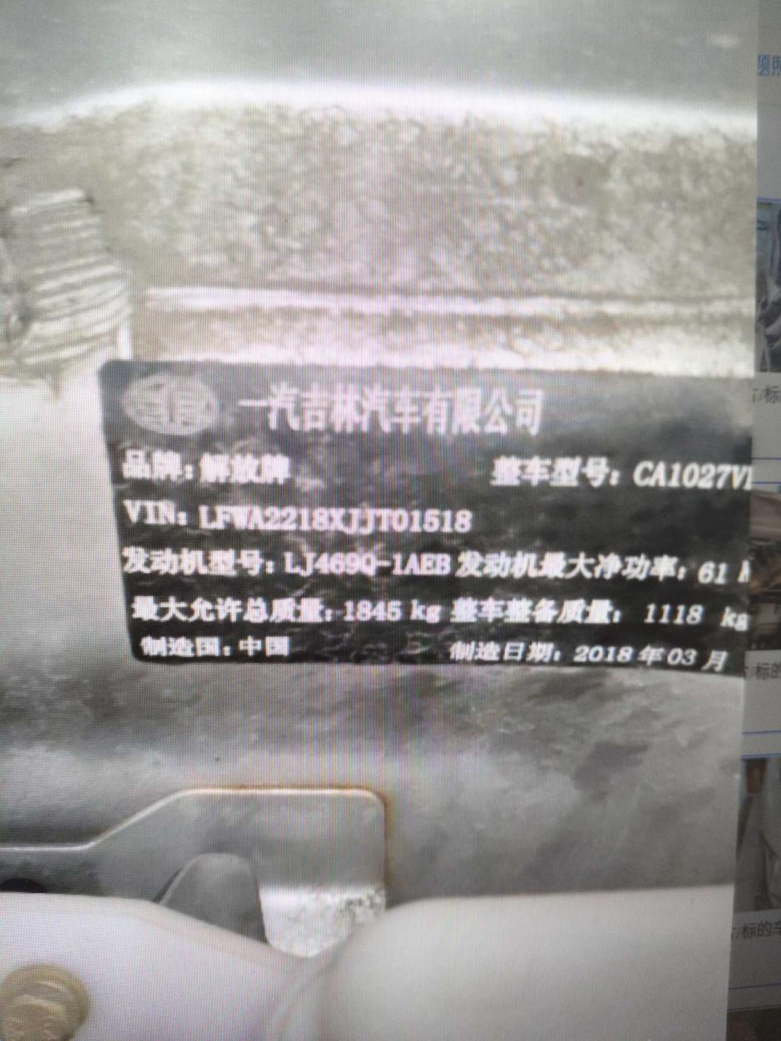 初次登记日期 2018-10-17 车辆名称 一汽 解放T80