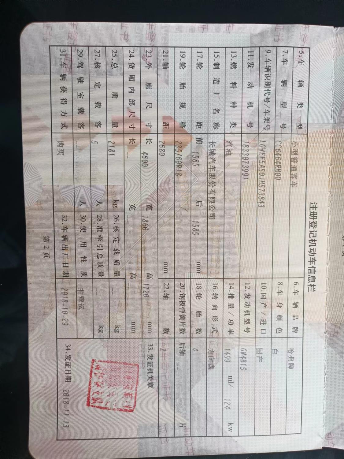 初次登记日期 2018-10-29 车辆名称 哈弗H6