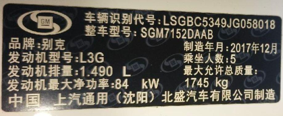 底盘号码 LSGBC5349JG058018 变速箱类型 手自一体