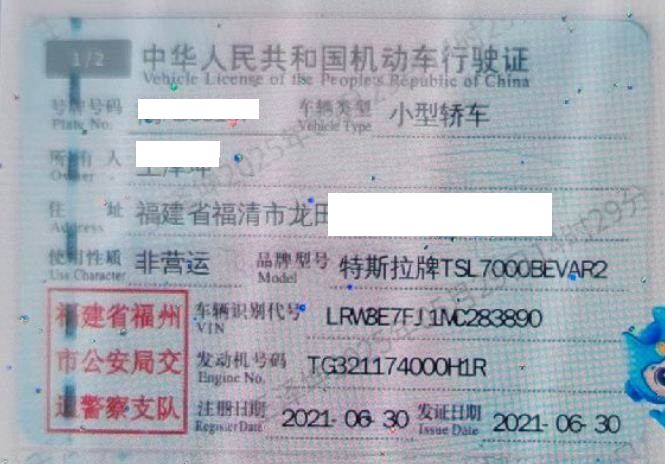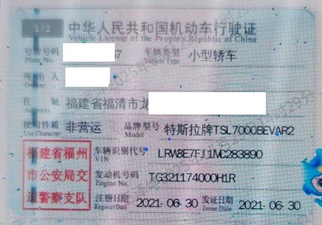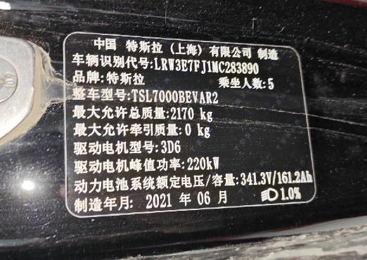 初次登记日期 2021-06-30 车辆名称 特斯拉 Model