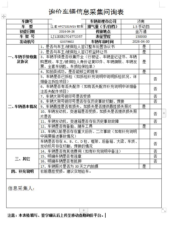 车架号是否受损 使用性质 非营运