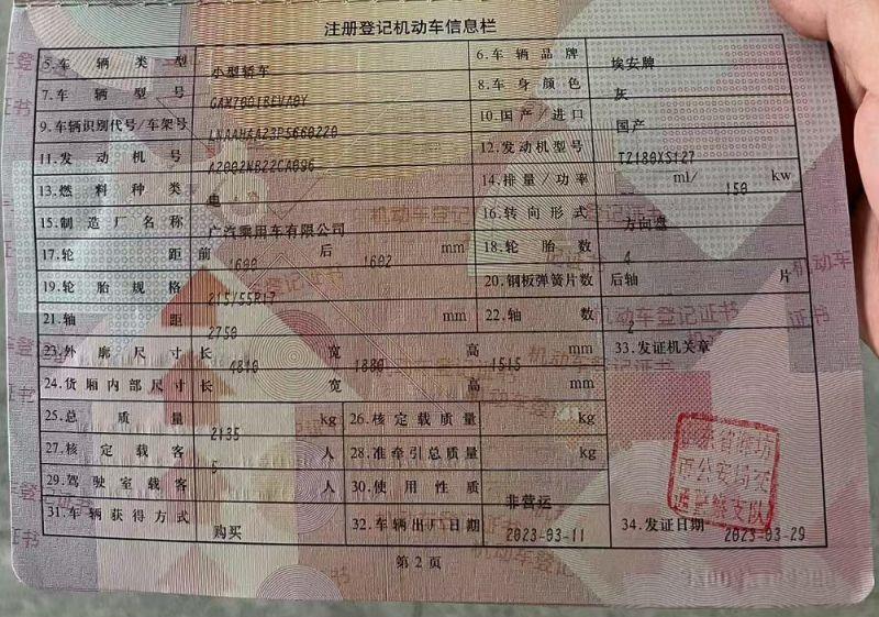 初次登记日期 2023-03-11 车辆名称 埃安 AION