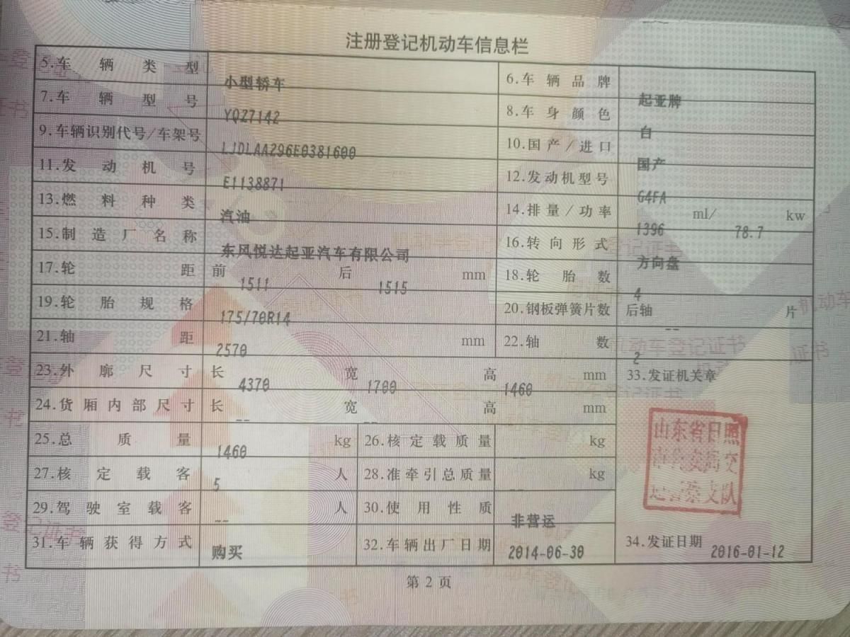 初次登记日期 2014-06-30 车辆名称 起亚牌