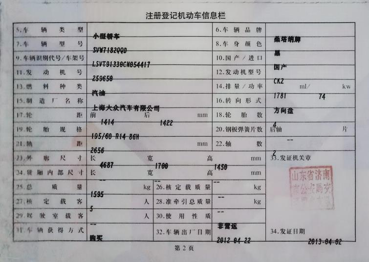 初次登记日期 2012-04-22 车辆名称 大众 桑塔纳志俊