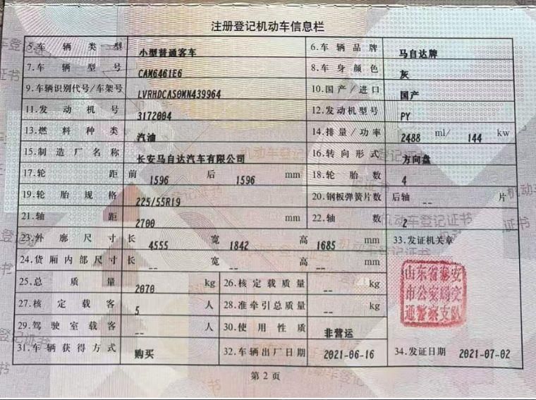 车牌号 鲁****** 品牌 马自达
