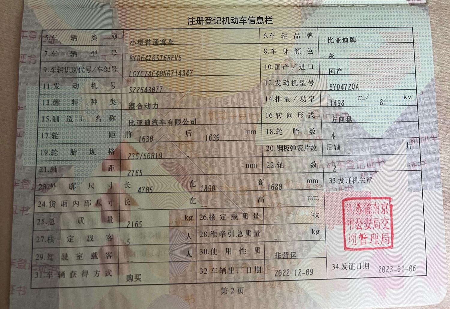 初次登记日期 2023-01-06 车辆名称 比亚迪 宋