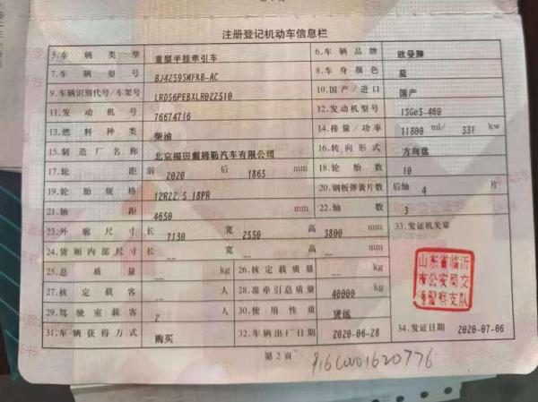 初次登记日期 2020-06-28 车辆名称 福田 欧曼神舟