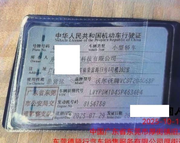 车辆归属地 广东省东莞 车辆停放仓库 广东省东莞市东莞市