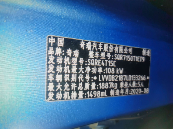 初次登记日期 2020-08-31 车辆名称 奇瑞 瑞虎7