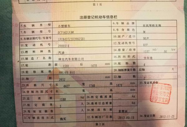 初次登记日期 2013-11-25 车辆名称 雪铁龙 爱丽舍