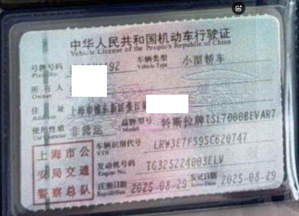 初次登记日期 2025-08-29 车辆名称 特斯拉 Model