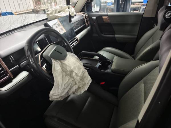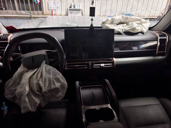 该车发生碰撞,导致车辆前部受损严重,底盘件受损,车内爆气囊。发动机舱内配件隐损【二询备注:解押超期】