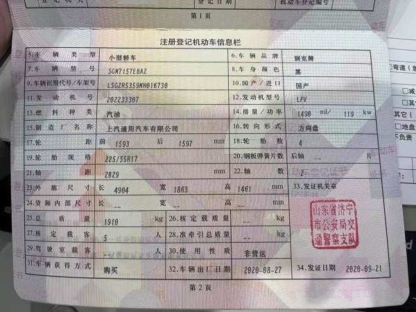 初次登记日期 2020-09-21 车辆名称 别克 君威