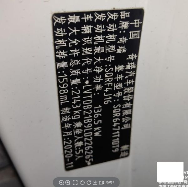 初次登记日期 2020-12-18 车辆名称 奇瑞 瑞虎8