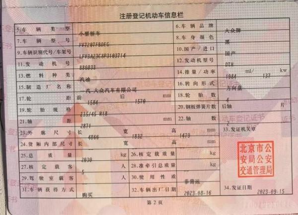 初次登记日期 2023-09-15 车辆名称 大众 迈腾