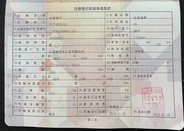 初次登记日期 2024-01-28 车辆名称 比亚迪 宋L