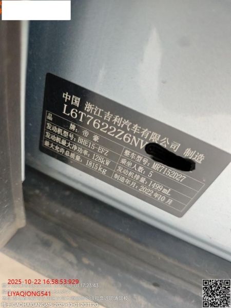 初次登记日期 2022-11-12 车辆名称 吉利汽车 吉利ICON