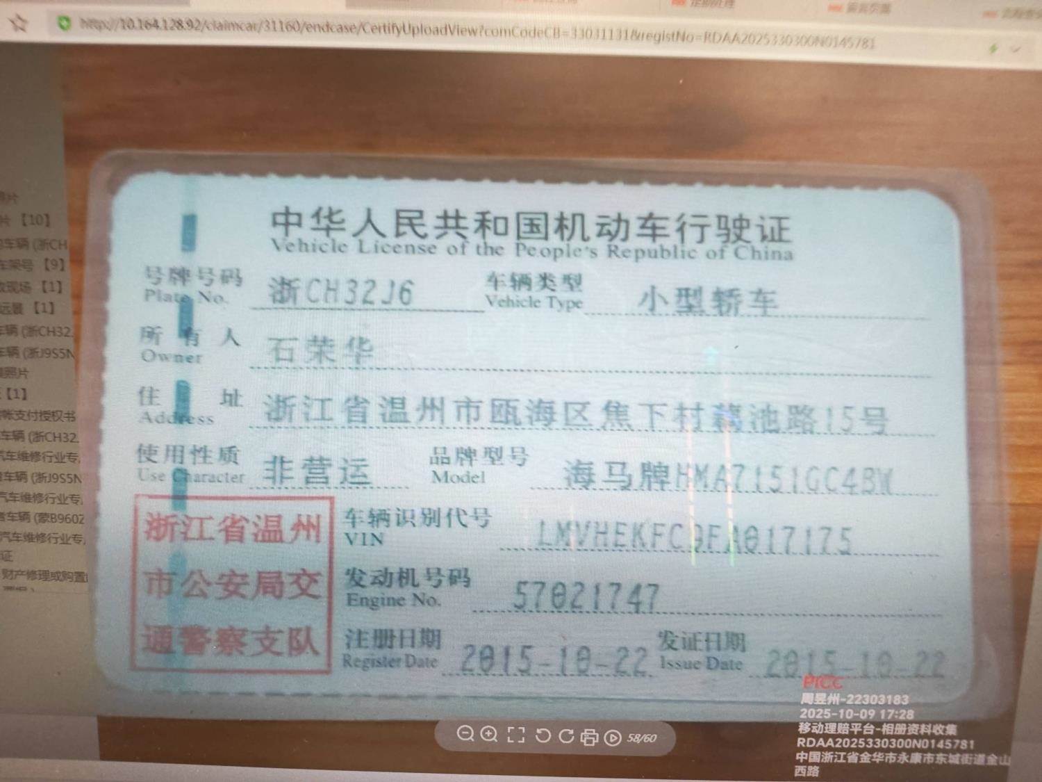 车牌号 浙****** 品牌 海马