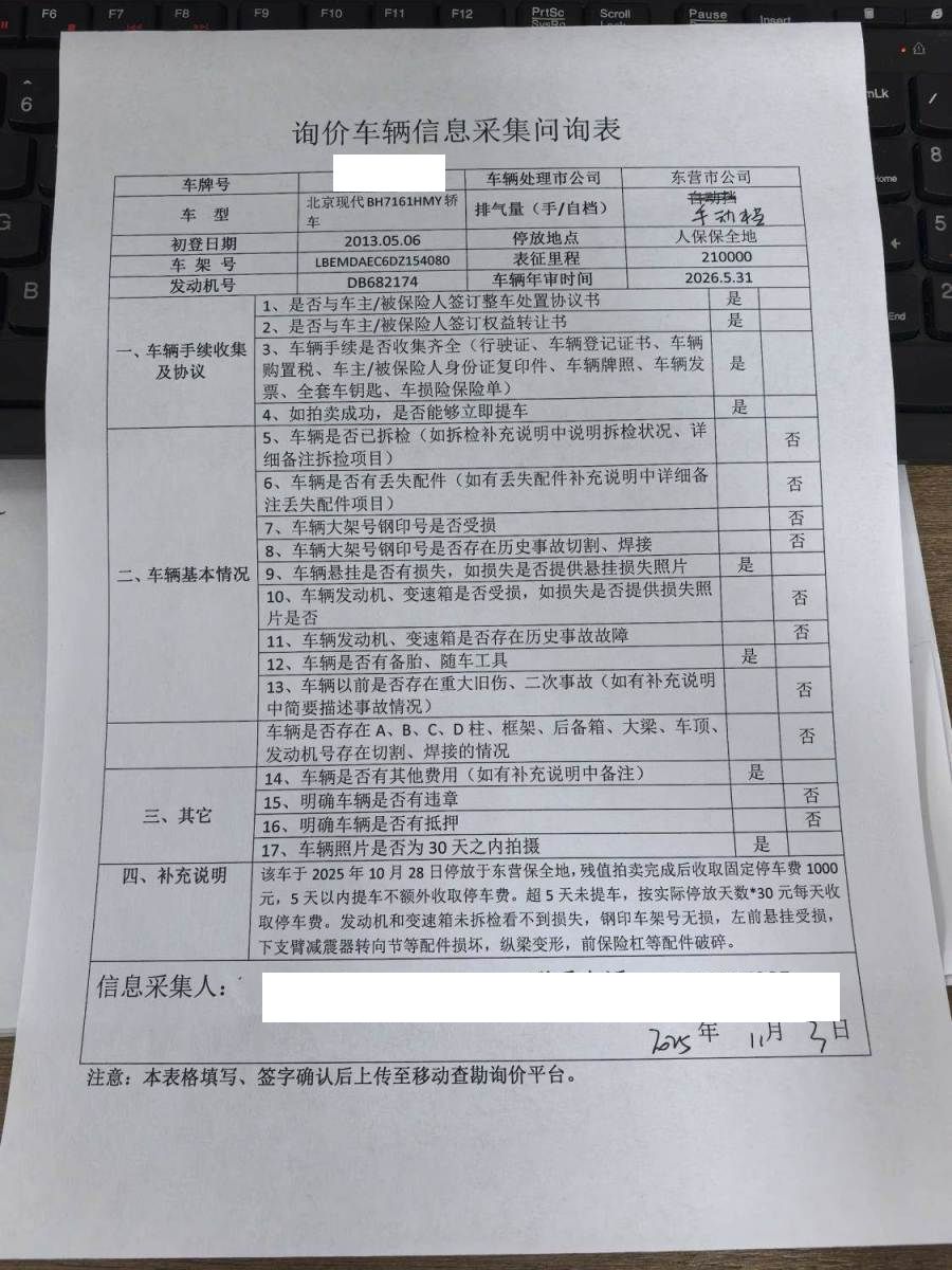该车于2025年10月28日停放于东营保全地,残值拍卖完成后收取固定停车费,5天以内提车不额外收取停车费。超5天未提车,按实际停放天数*30元每天收取停车费。发动机和变速箱未拆检看不到损失,钢印车架号无损,左前悬挂受损,下支臂减震器转向节等配件损坏,纵梁变形,前保险杠等配件破碎。 5年以上车辆报价后不得以二次事故为由提出议价或退车弃标。 需提供报废证明,未提供则收取1000元平台使用费!
