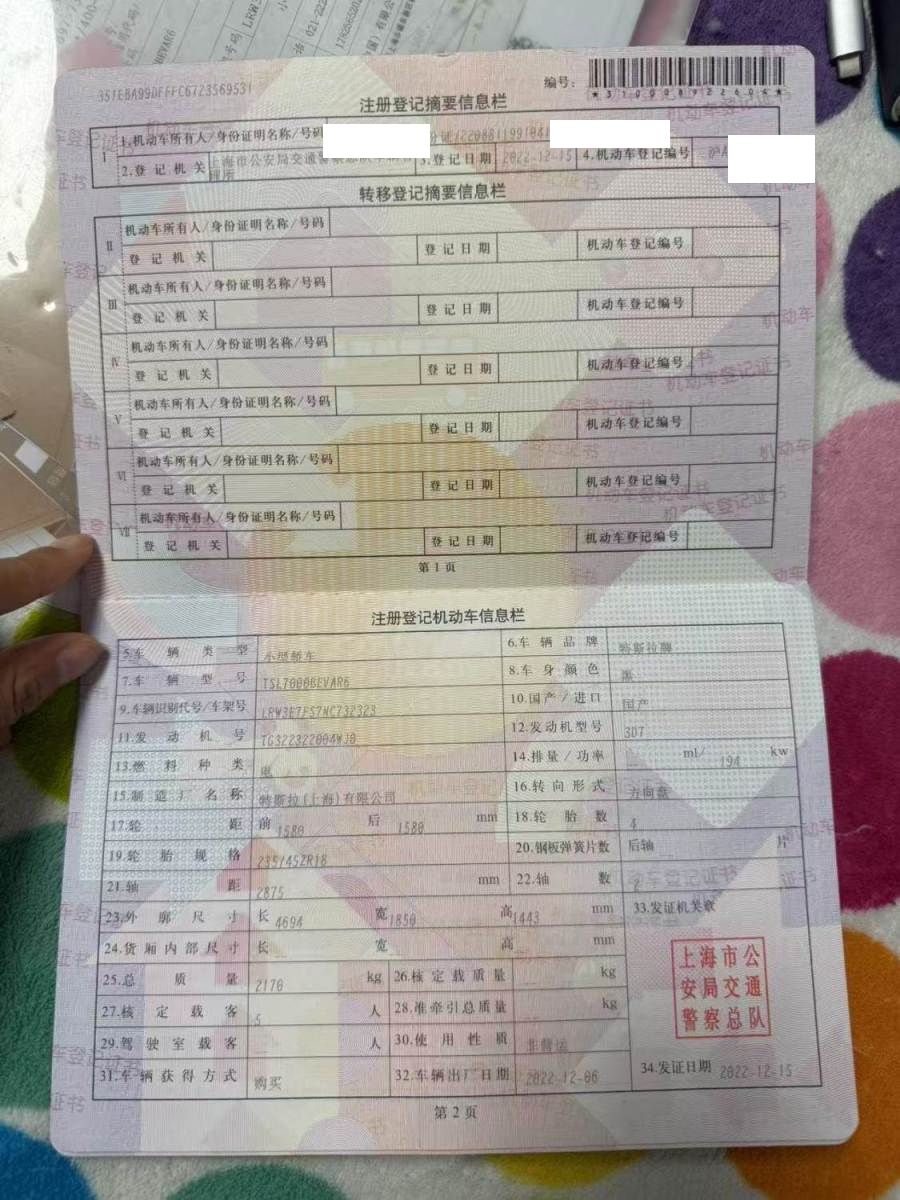 初次登记日期 2022-12-15 车辆名称 特斯拉 Model