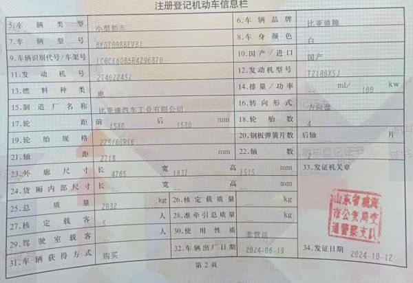 初次登记日期 2024-10-12 车辆名称 比亚迪 秦