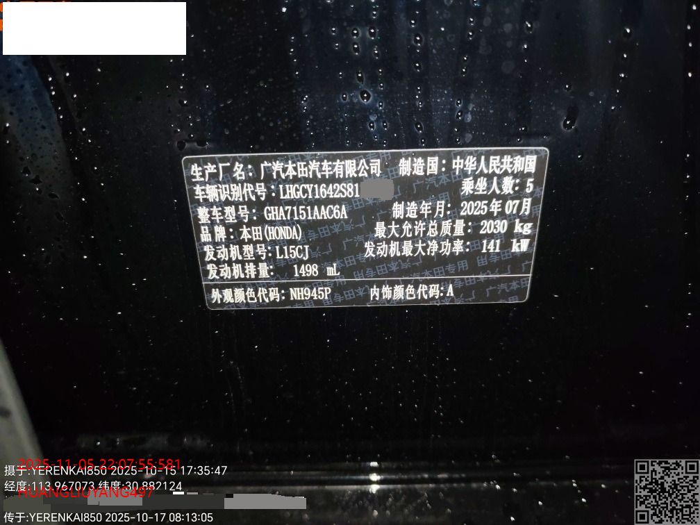 初次登记日期 2025-08-15 车辆名称 本田 雅阁