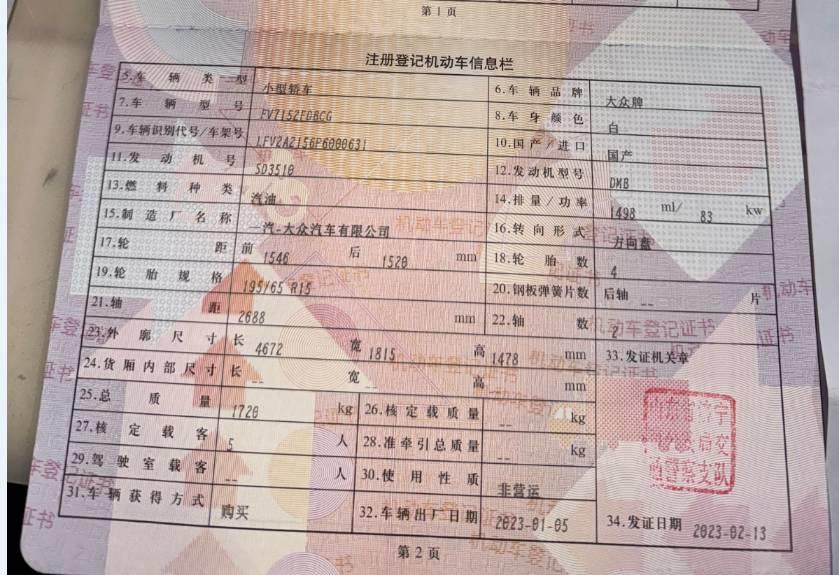 初次登记日期 2023-02-13 车辆名称 大众 宝来