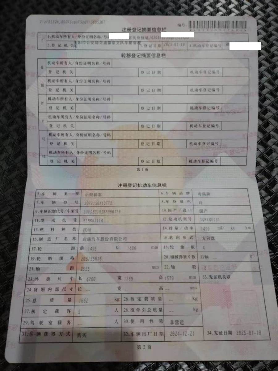 初次登记日期 2025-01-10 车辆名称 奇瑞 瑞虎3x