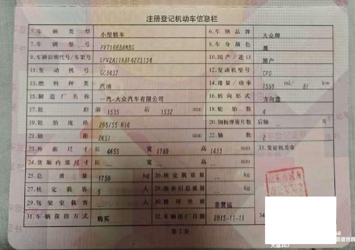 初次登记日期 2015-11-11 车辆名称 大众 速腾
