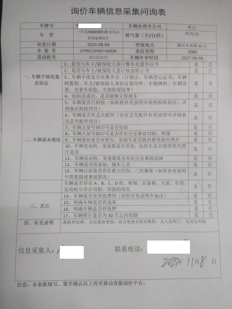 车架号是否受损 未知 使用性质 非营运