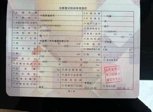 初次登记日期 2025-09-13 车辆名称 奔腾 悦意