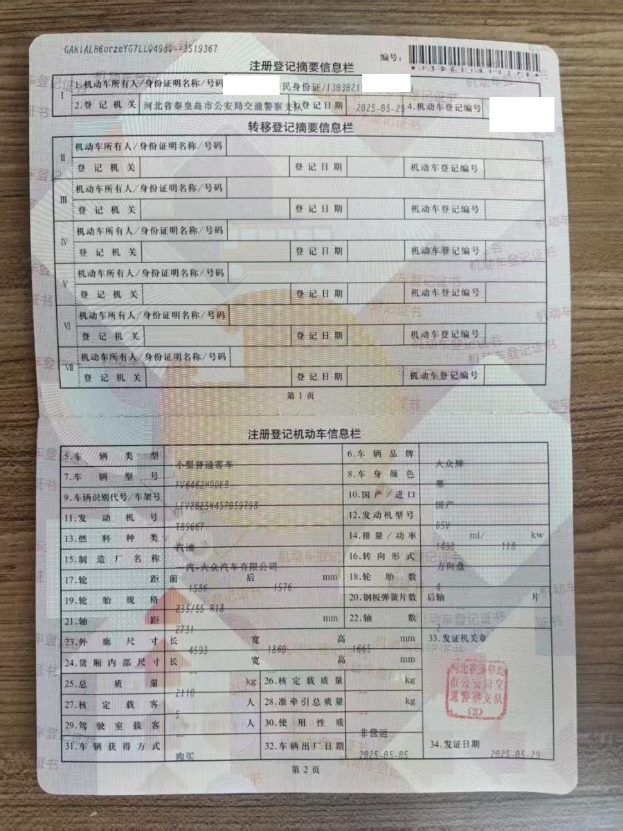 初次登记日期 2025-05-29 车辆名称 大众 探岳