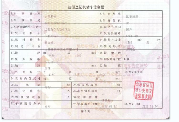 初次登记日期 2025-01-05 车辆名称 比亚迪