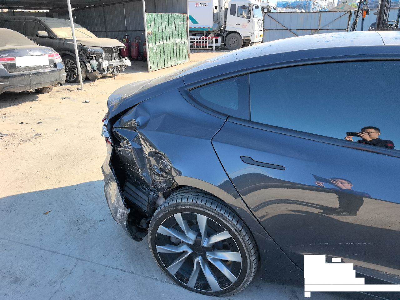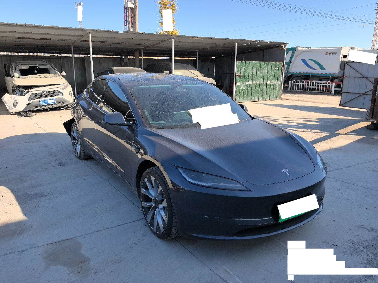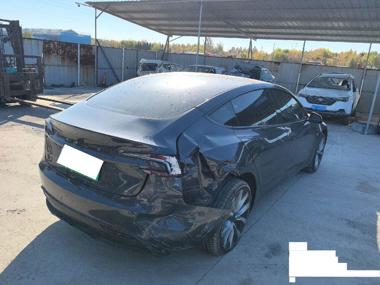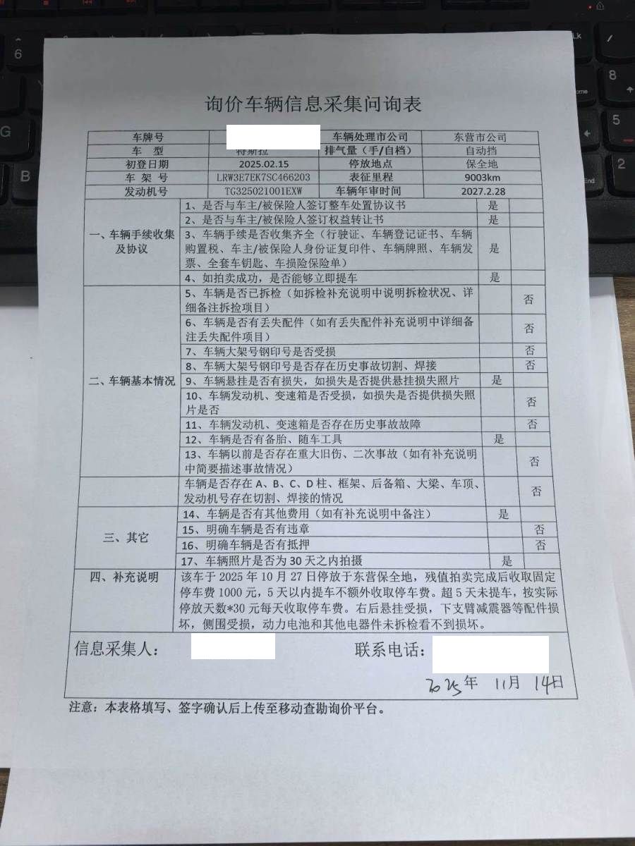 该车于2025年10月27日停放于东营保全地,,5天以内提车不额外收取停车费。超5天未提车,按实际停放天数*30元每天收取停车费。右后悬挂受损,下支臂减震器等配件损坏,侧围受损,动力电池和其他电器件未拆检看不到损坏。