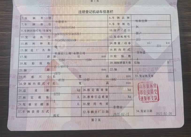 初次登记日期 2025-02-24 车辆名称 特斯拉 Model