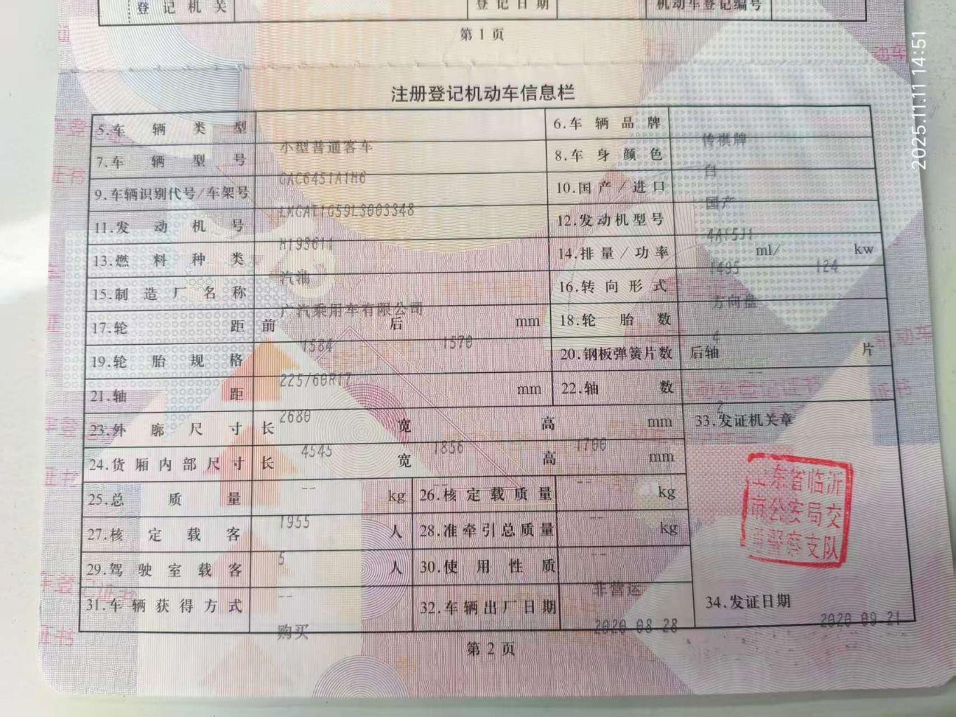 初次登记日期 2020-08-28 车辆名称 广汽传祺 传祺GS4