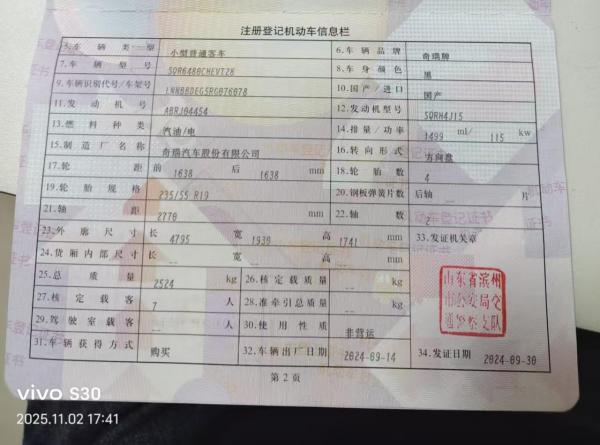 初次登记日期 2024-09-14 车辆名称 奇瑞风云 风云T9