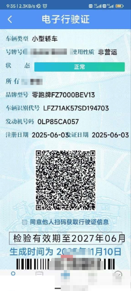 初次登记日期 2025-06-03 车辆名称 零跑汽车 零跑T03
