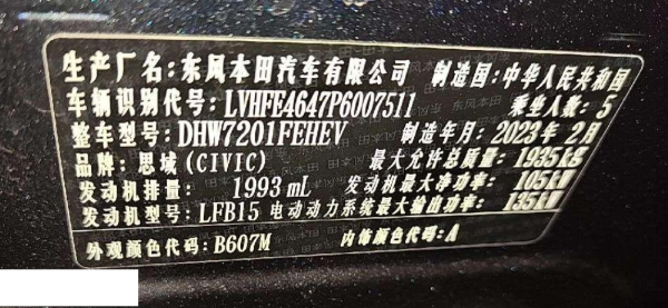 初次登记日期 2023-03-16 车辆名称 本田 思域