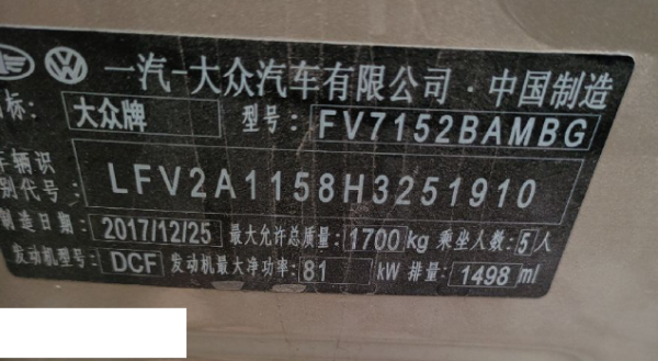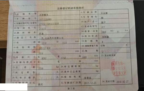 初次登记日期 2018-02-27 车辆名称 大众 宝来