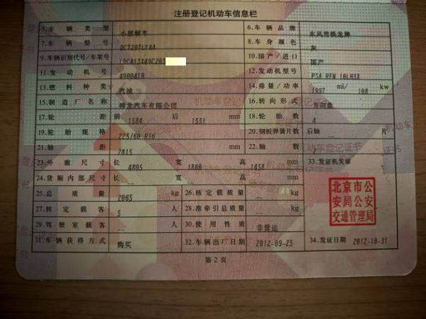 车牌号 京****** 品牌 雪铁龙