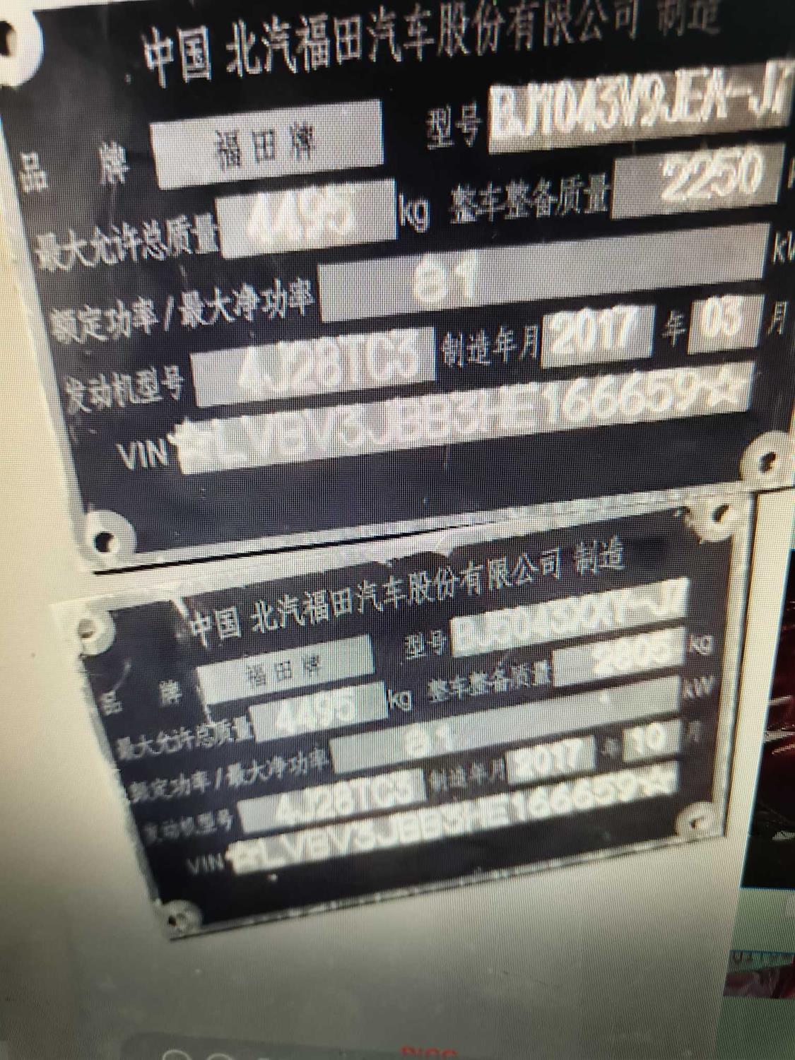 初次登记日期 2017-11-07 车辆名称 福田 奥铃