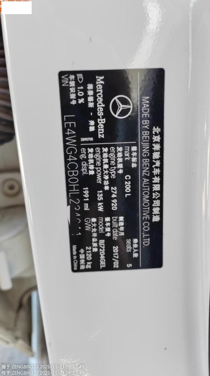 初次登记日期 2017-03-30 车辆名称 奔驰C级