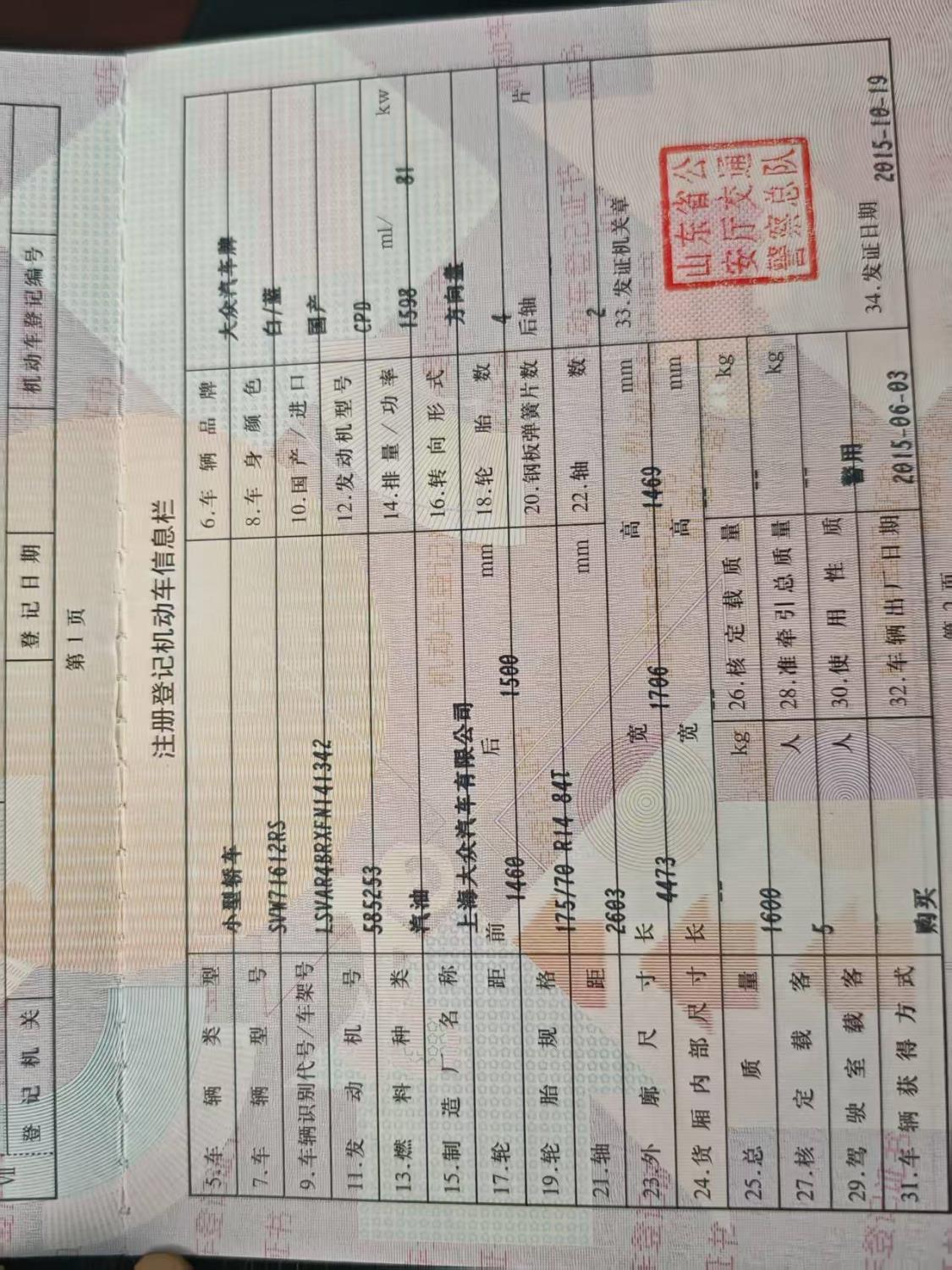 初次登记日期 2015-10-19 车辆名称 大众 桑塔纳